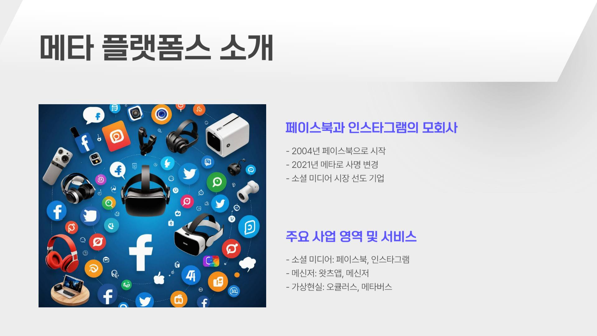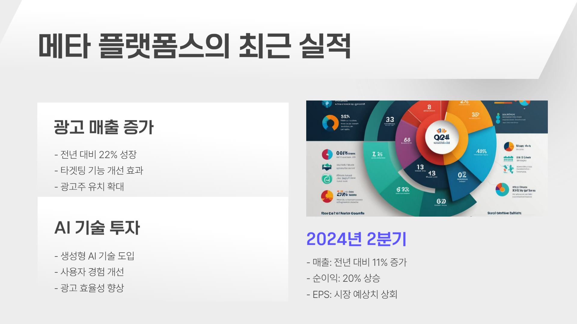 ๋ฉํ๋ ์ต๊ทผ ์ธ๊ณต์ง๋ฅ(AI) ๊ธฐ์ ์ ๋๊ท๋ชจ๋ก ๋์ ํ๋ฉฐ, ๋ฉํ AI(์์ฒด ์์ฑํ AI ๋ชจ๋ธ)์ AI ๊ธฐ๋ฐ ์ถ์ฒ ์๊ณ ๋ฆฌ์ฆ์ ๊ฐ์ ํ๊ณ ์์ต๋๋ค. AI๋ ๊ด๊ณ ๋น์ฆ๋์ค ๋ฐ ์ฝํ ์ธ ์ถ์ฒ ์์ง์ ๊ฐํํ๋ ๋ฐ ํฐ ์ญํ ์ ํ๋ฉฐ, ๋ฉํ์ ๊ด๊ณ ๋งค์ถ ์ฆ๊ฐ๋ก ์ด์ด์ง๊ณ ์์ต๋๋ค.