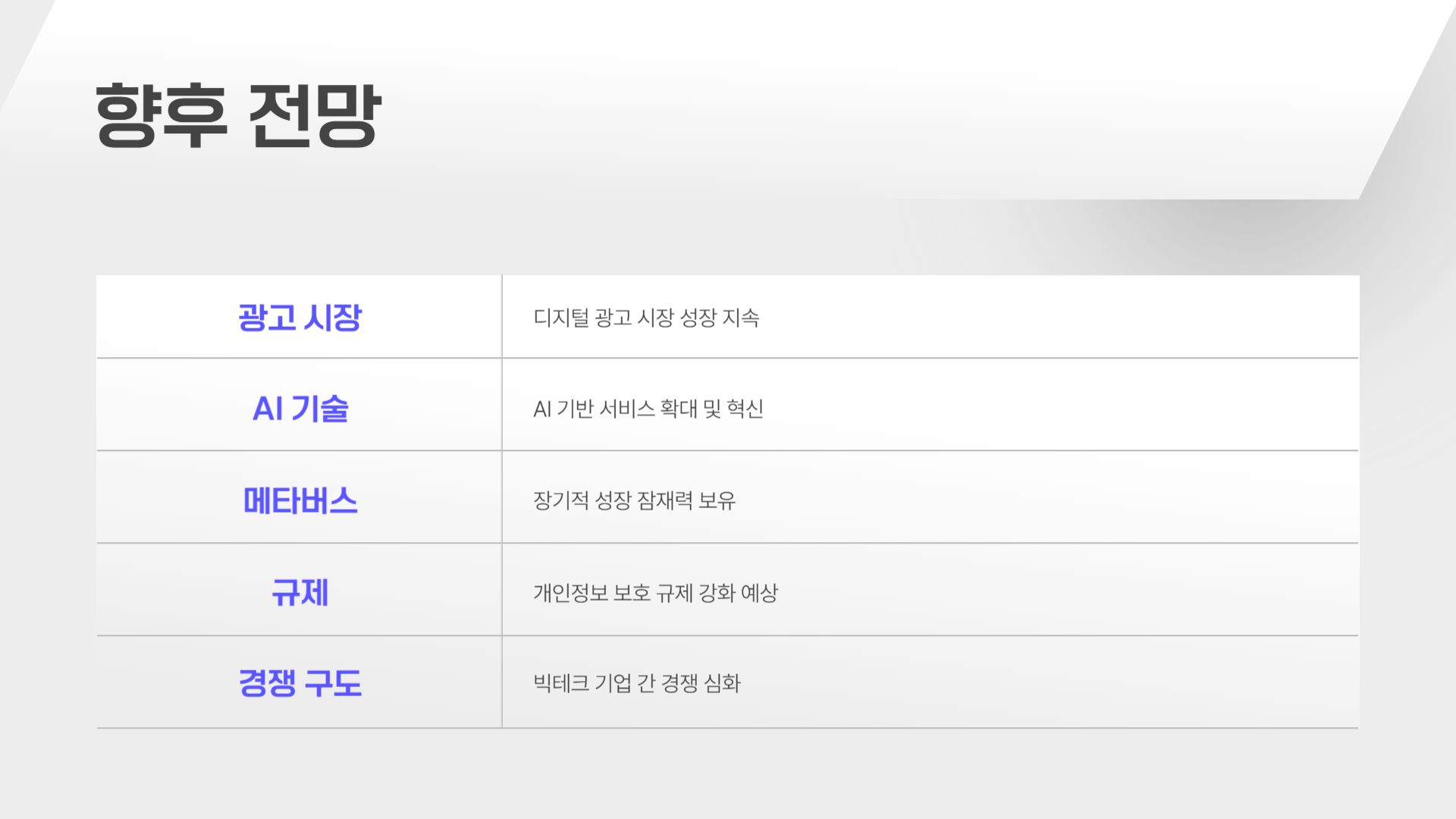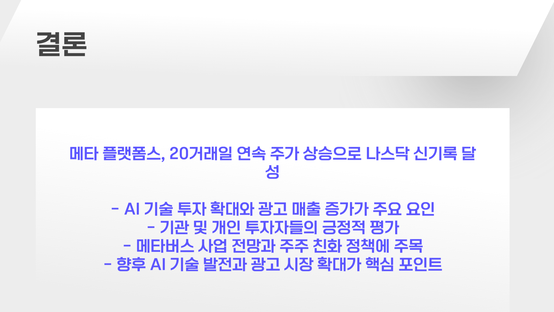 ํ์ง๋ง ํ์ฌ๊น์ง์ ์์ฅ ๋ถ์๊ธฐ๋ ๋ฉํ์ ์ฑ์ฅ ๊ฐ๋ฅ์ฑ์ ๊ธ์ ์ ์ผ๋ก ํ๊ฐํ๋ ๋ถ์๊ธฐ๊ฐ ๊ฐํฉ๋๋ค. AI ์์ฅ ํ์ฅ๊ณผ ์๋ก์ด ๊ธฐ์ ๋์ ์ด ์ฃผ๊ฐ๋ฅผ ์ง์์ ์ผ๋ก ๋์ด์ฌ๋ฆด ์ ์์ ๊ฒ์ผ๋ก ์์๋ฉ๋๋ค.