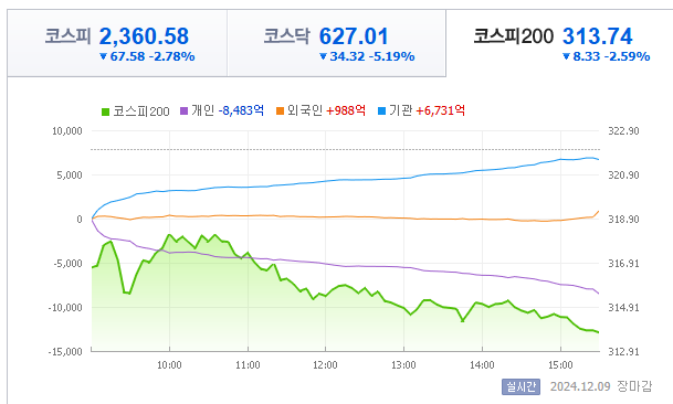 - ์ฝ์คํผ: ์ ์ผ ๋๋น 67.58ํฌ์ธํธ(-2.78%) ํ๋ฝ, 2360.58๋ก ๋ง๊ฐ (1๋ 1๊ฐ์ ๋ง์ ์ต์ ์น)