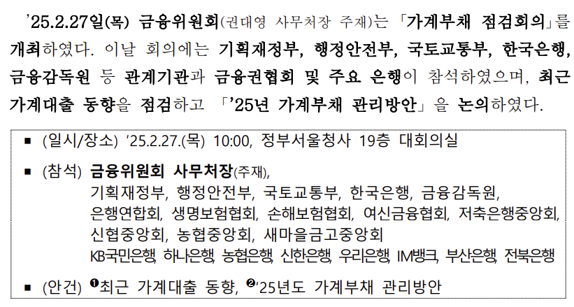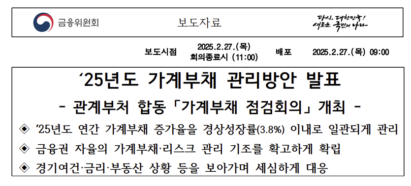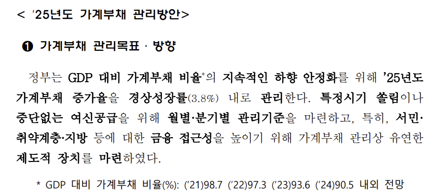์ ๋ถ๊ฐ 2025๋ ๊ฐ๊ณ๋ถ์ฑ ๊ด๋ฆฌ๋ฐฉ์์ ๋ฐํํ๋ฉฐ, ๊ฐ๊ณ๋์ถ ์ฆ๊ฐ์จ์ ๊ฒฝ์์ฑ์ฅ๋ฅ (3.8%) ์ด๋ด๋ก ์ ์งํ๋ ๊ฒ์ ๋ชฉํ๋ก ํ๊ณ ์์ต๋๋ค. ๊ธ์ต์์ํ๋ฅผ ๋น๋กฏํ ๊ด๊ณ๋ถ์ฒ์ ์ฃผ์ ๊ธ์ต๊ธฐ๊ด์ด ์ฐธ์ํ ‘๊ฐ๊ณ๋ถ์ฑ ์ ๊ฒํ์’์์ ๋ ผ์๋ ํต์ฌ ๋ด์ฉ์ ์ ๋ฆฌํด๋ณด๊ฒ ์ต๋๋ค.