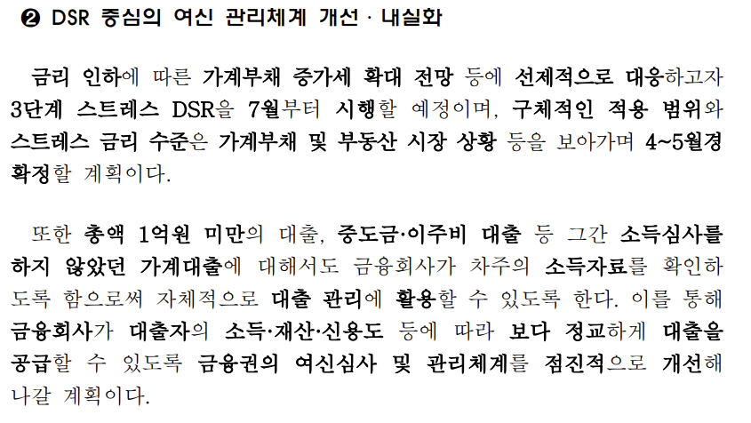 - 2025๋ 7์๋ถํฐ ‘3๋จ๊ณ ์คํธ๋ ์ค DSR’์ด ๋์ ๋๋ฏ๋ก, ๋ณธ์ธ์ DSR ๋น์จ์ ๋ฏธ๋ฆฌ ๊ณ์ฐํ๊ณ ๋์ถ ํ๋๋ฅผ ์ ๊ฒํด์ผ ํฉ๋๋ค.